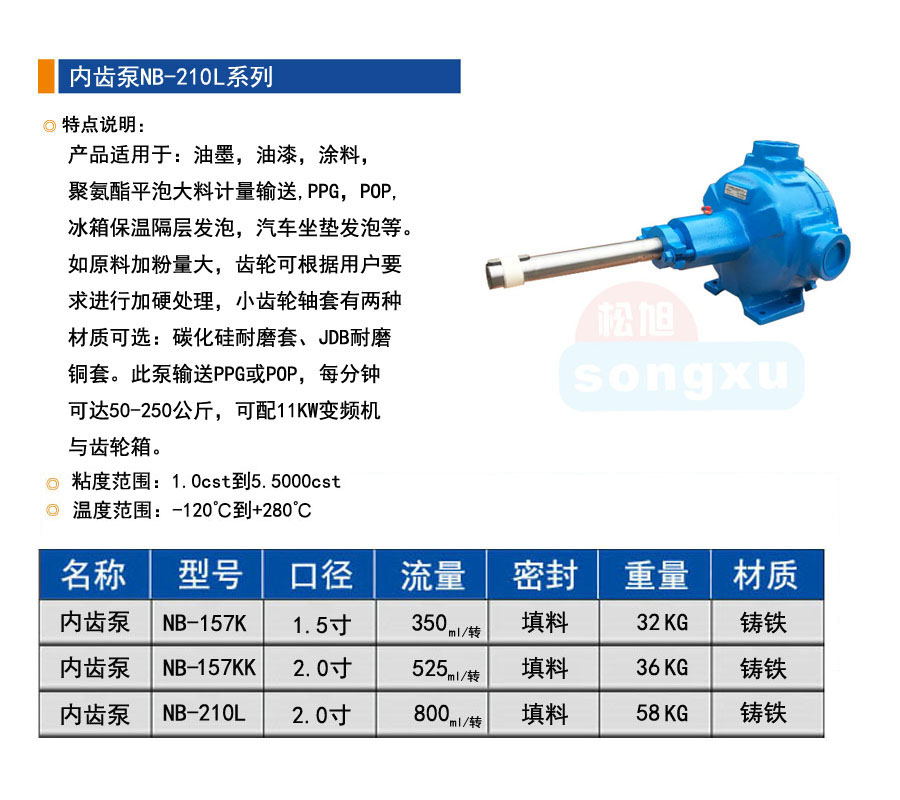 产品适用于:油墨,油漆,涂料,聚氨酯平泡大料计量输送,PPG,POP,冰箱保温隔层发泡,汽车坐垫发泡等。如原料加粉量大,齿轮可根据用户要求进行加硬处理,小齿轮轴套有两种材质可选:碳化硅耐磨套、JDB耐磨铜套。此泵输送PPG或POP,每分钟可达50-250公斤,可配11KW变频机与齿轮箱。