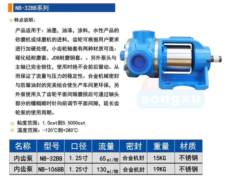 产品适用于:油墨,油漆,涂料,水性产品的砂磨机或球磨机的进料,齿轮可根据用户要求进行加硬处理,小齿轮轴套有两种材质可选:碳化硅耐磨套、JDB耐磨铜套。。另外泵头与主轴已完全锁住,使用时绝不会前后窜动。从而保证了流量与压力的稳定性。合金机械密封与防腐油封的完美组合使生产车间更环保,另外泵使用久了齿轮平面间隙磨损后可通过轴头部分的螺帽顺时针向前调节平面间隙,延长齿轮泵的使用周期。